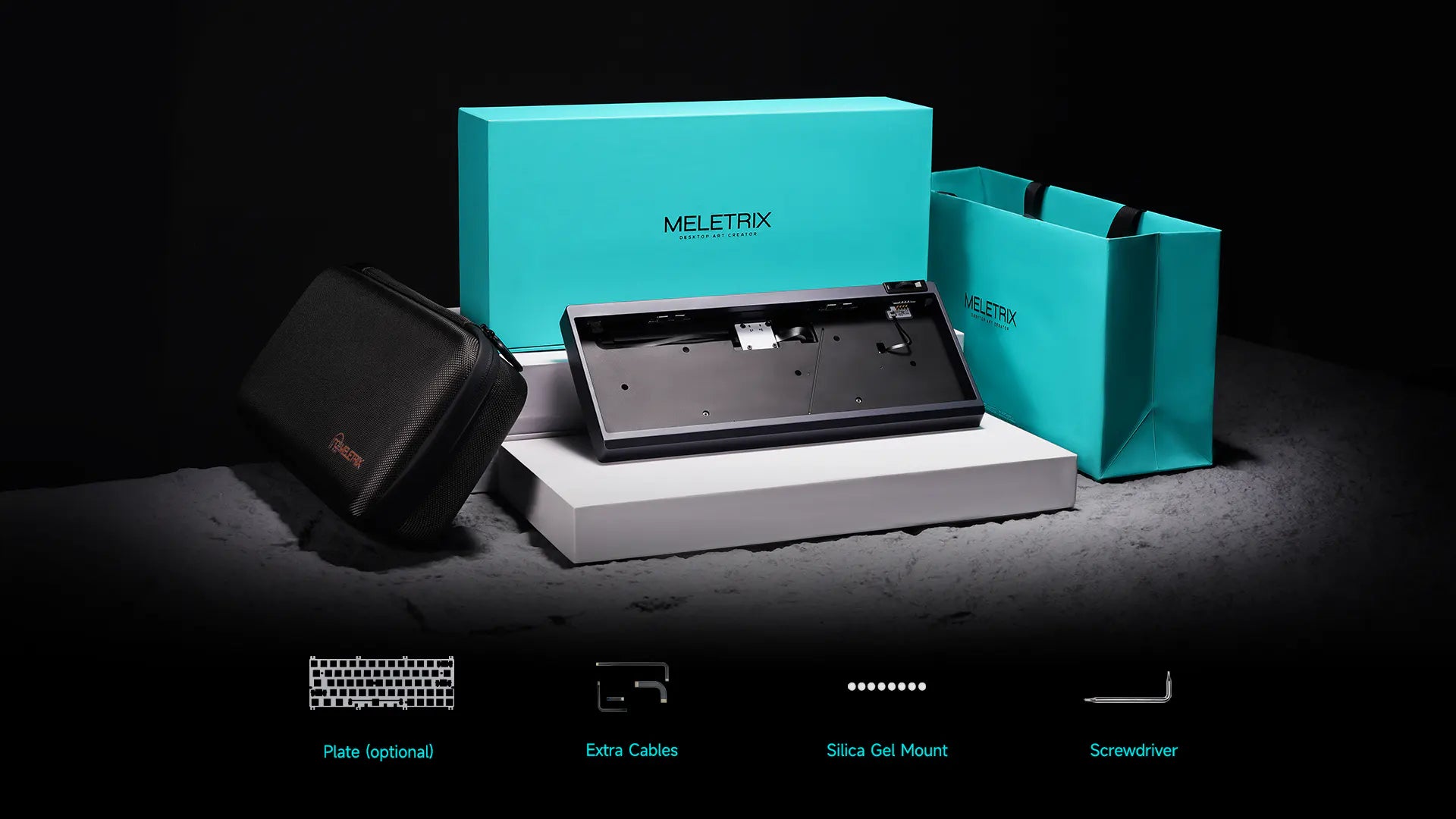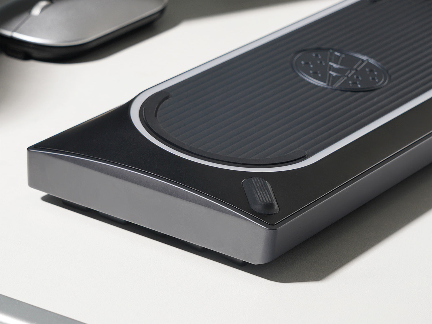 The “racetrack” curved weight with wave texture provides a secure grip when moving the keyboard. Twin-eared feet appear to listen to each keystroke, visually merging with the grand curve.