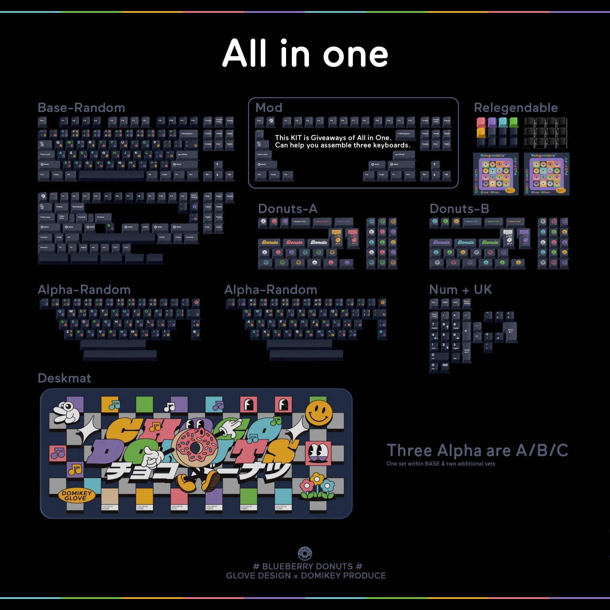 For All in ONE kit, this KIT included an extra MOD that can help you build 3 keyboards, also included deskmat.